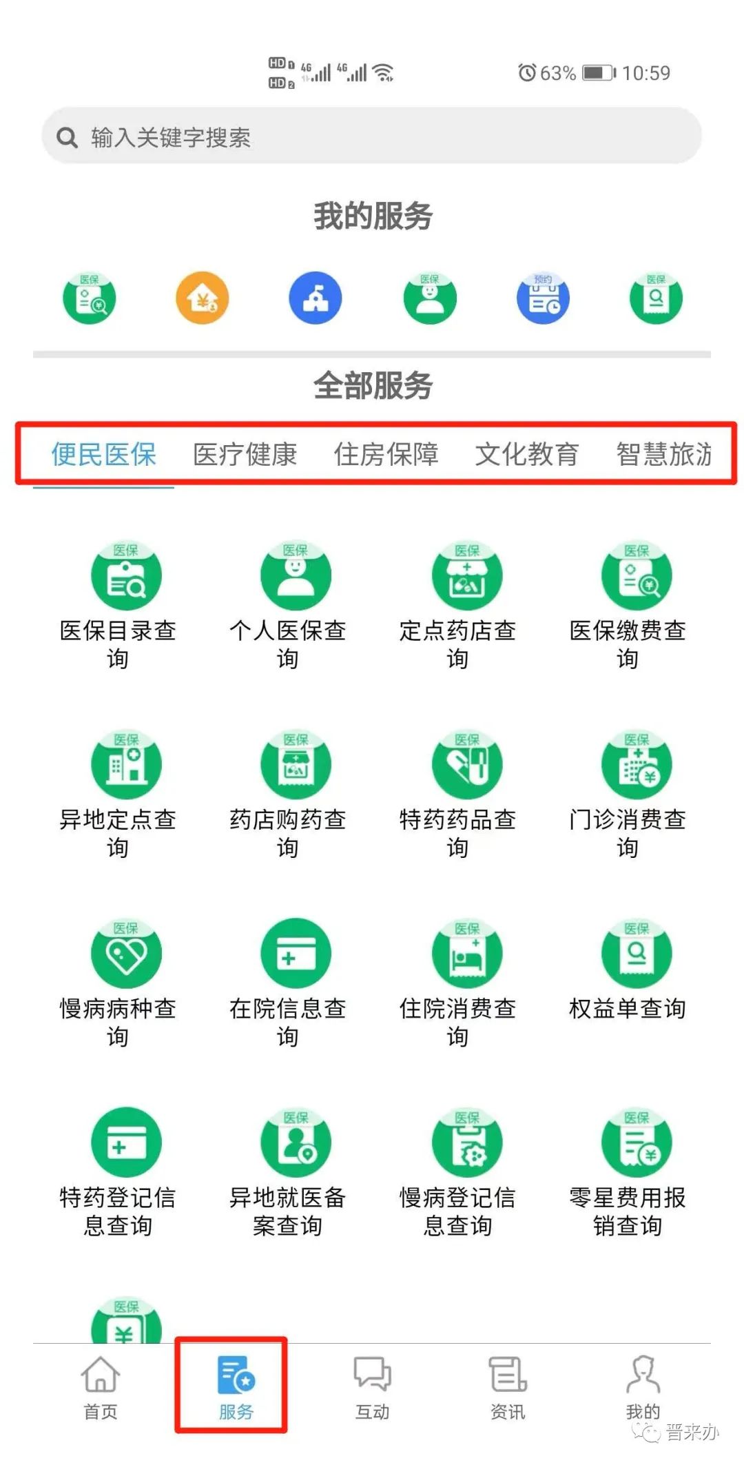 在“晋来办”首页,底部菜单栏点击“服务”,即可按照主题分类进行服务查找。“晋来办”推出的所有服务,你都可以在这里找到。