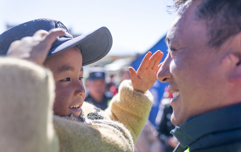 2025年1月14日,在受到地震波及的西藏定日县长所乡嘎布村,一名小朋友戴上了参加抗震救灾工作的移民警察米玛次仁的帽子,向他敬礼。新华社记者丁增尼达摄