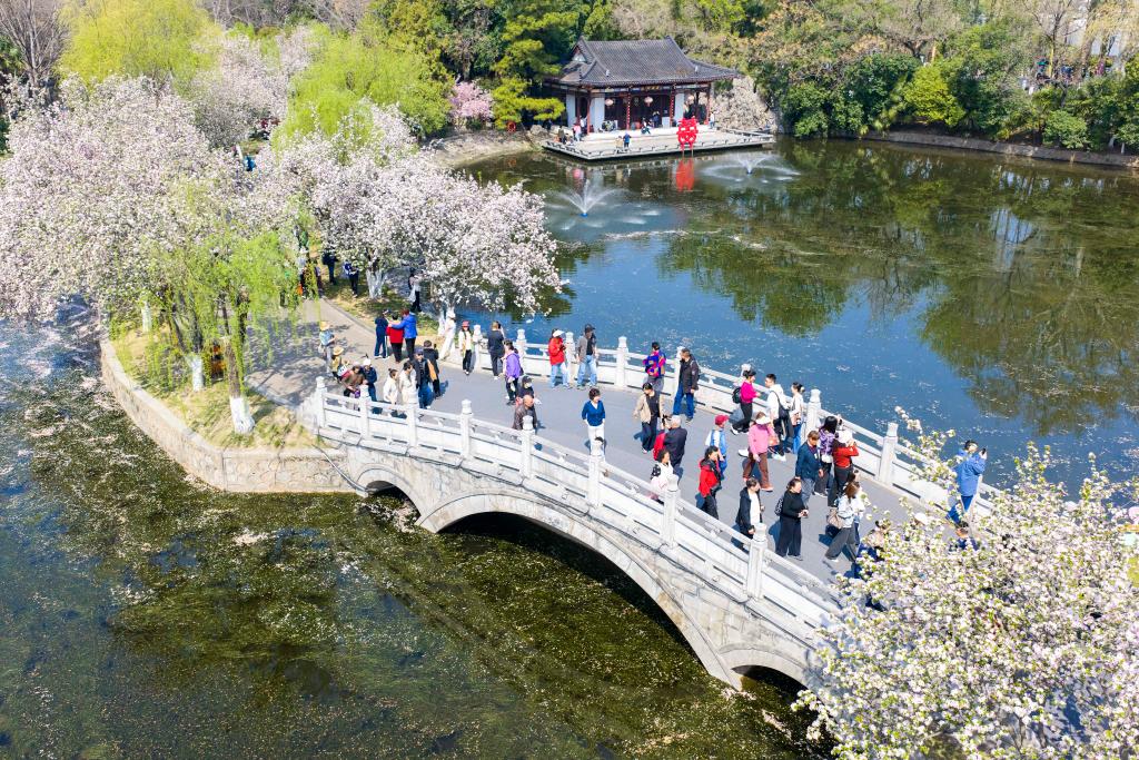 3月29日,游客在江苏南京莫愁湖公园赏花游玩(无人机照片)。新华社发(史俊 摄)