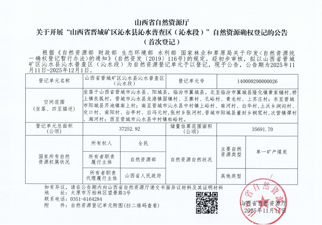 山西省自然资源厅关于开展“山西省晋城矿区沁水县沁水普查区(沁水段)”自然资源确权登记的公告(首次登记)