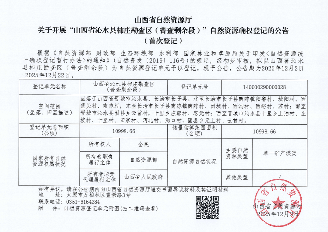 山西省自然资源厅关于开展“山西省沁水县柿庄勘查区(普查剩余段)”自然资源确权登记的公告(首次登记)