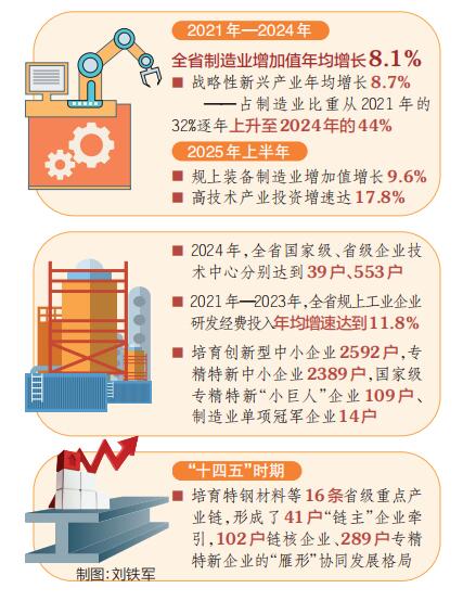 统计数据显示,2021年—2024年,全省制造业增加值年均增长8.1%,战略性新兴产业年均增长8.7%,占制造业比重从2021年的32%逐年上升至2024年的44%。2025年上半年全省规上装备制造业增加值增长9.6%,高技术产业投资增速达17.8%,战略性新兴产业对工业增长贡献率日渐提高。