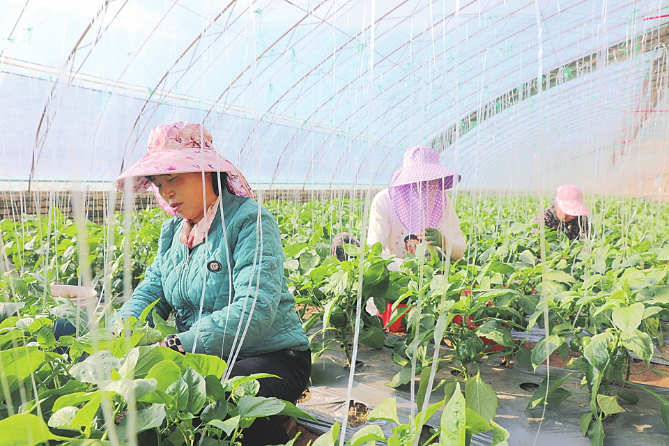 在朔州农商行支持下,该市朔城区甘源彩椒种植专业合作社发展迅速。图为合作社工人们在大棚里为彩椒吊枝。季洲晨摄