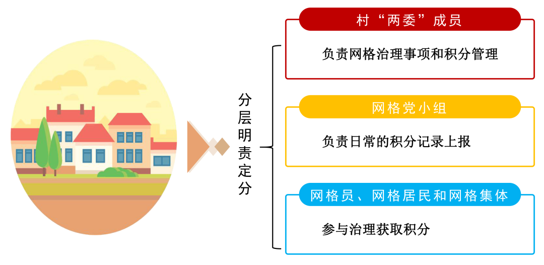 网格积分主要分三个层次:网格员履职积分。在职能赋分基础上实行正向加分、反向扣分,正向设置隐患排查、派工完成、群众动员等项目,每次加计1—10分;反向设置信息摸排不到位、问题处置不力等项目,每次扣减1—5分,严重失职失责一次清零,动态反映网格员履职情况。网格居民志愿积分。设置举报奖励、好人好事、建言献策、立功表现等项目,每次加计1—2分,事迹突出的经网格党小组研究酌情加分。举报奖励指网格居民发现问题线索,通过“随手拍”“随时报”向网格平台上报;好人好事指主动或协调处置解决问题,为集体和群众挽回损失;建言献策指着眼村长远发展、重点工作任务推进提出建设性意见;立功表现指为村增加荣誉、落地重大项目等有立功表现。网格集体捆绑积分。实行“个人+家庭+网格”机制,设置个人表现分、家庭贡献分两个项目。个人表现分,将网格员履职积分、网格居民志愿积分分别按照10倍、5倍的比例计入网格集体积分;家庭贡献分,主要设置好人好事、表彰奖励、升学入伍等加分项,设置矛盾冲突、越级上访、违法犯罪等减分项,直接计入网格集体积分。同时,年底网格集体总积分排名前三的网格单元,分别额外计5000分。