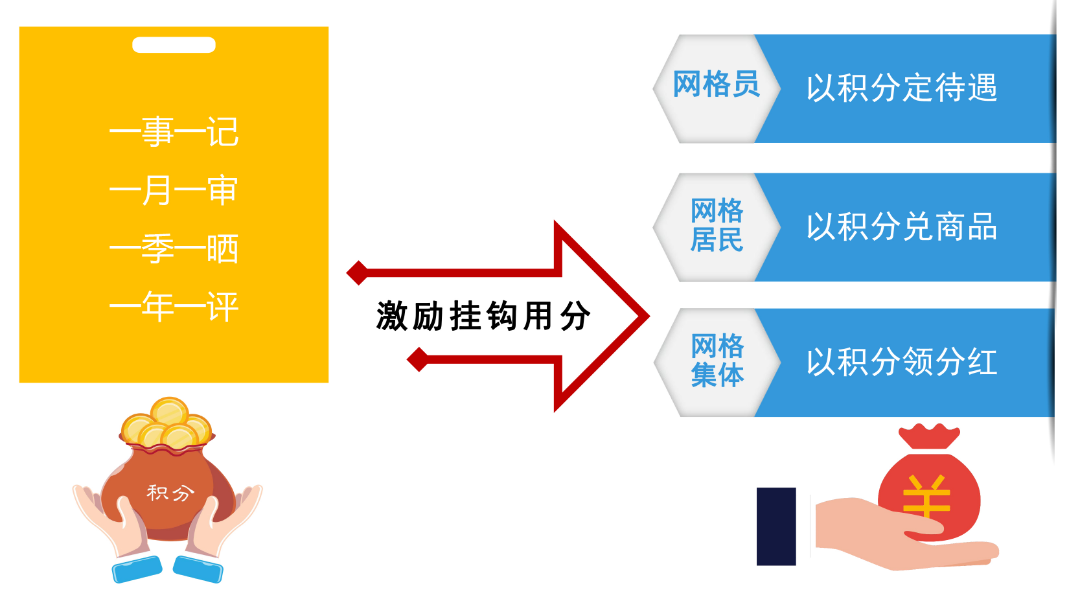 网格积分实行一事一记、一月一审、一季一晒、一年一评,分层分类设置积分榜,依据积分进行相应物质奖励和精神激励。
