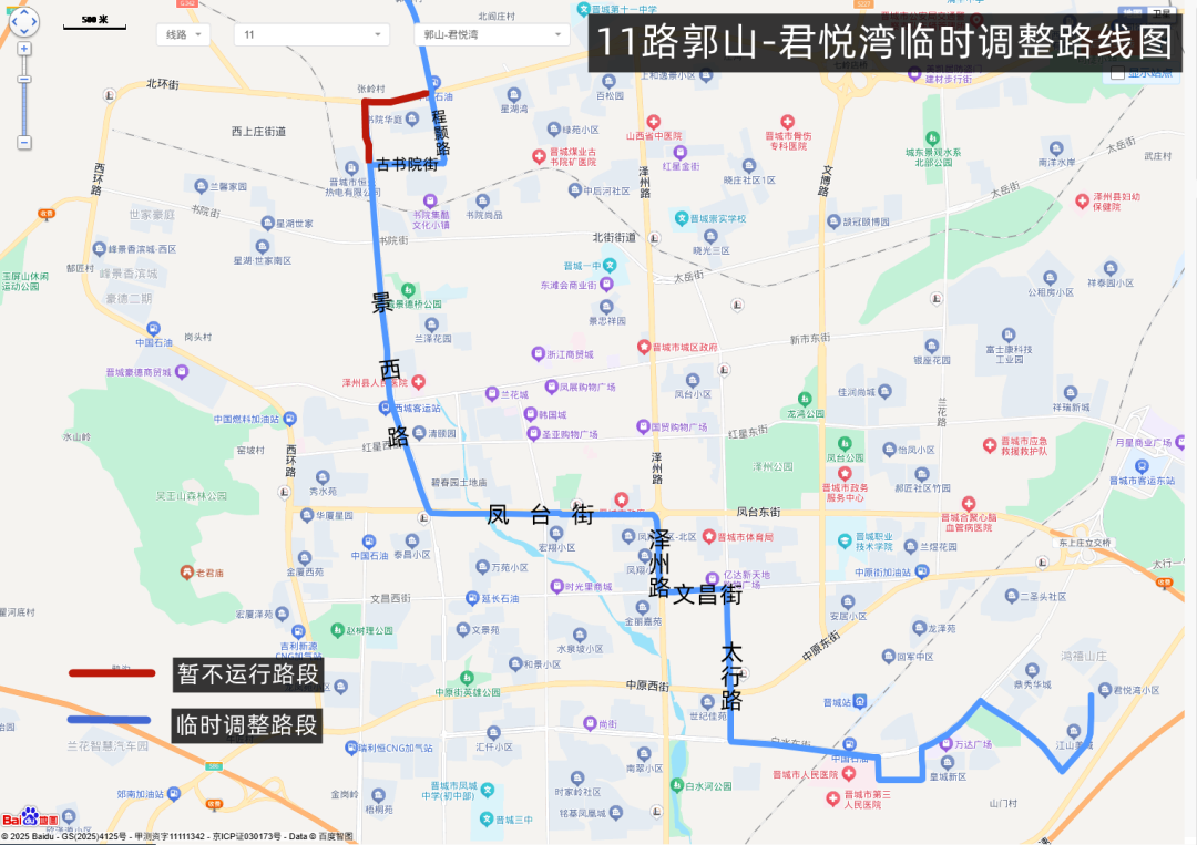 根据晋城市公安局交通管理支队、晋城国投智慧产业发展有限公司发布的《关于对北环路部分路段进行施工的通告》,因凤城智慧颐养园(一期)园区道路工程总承包项目施工,于2025年11月1日至2027年8月31日对屋厦立交施工区域、景忠路跨线桥施工区域、东河人行通道及箱涵施工区域、书院河人行通道及箱涵施工区域、景西路下穿通道施工区域、西河人行通道及箱涵施工区域、晋韩路下穿通道施工区域等进行封闭施工,封闭施工期间,过往社会车辆禁止驶入。受此影响,在道路封闭期间,将临时调整1路和11路绕行,具体为: