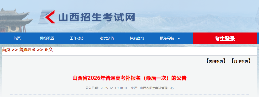 经研究,定于2025年12月4日8:00—5日18:00进行2026年普通高考网上补报名(最后一次)工作。按照《山西省招生考试管理中心关于做好我省2026年普通高校招生考试报名工作的通知》的要求,凡符合我省普通高考报考条件还未报名的高级中等教育学校毕业生或具有同等学力者均可参加报名,考生除艺术类的美术与设计类、音乐类、舞蹈类、书法类、表(导)演类戏剧影视导演方向专业外,其他科类均可报考。