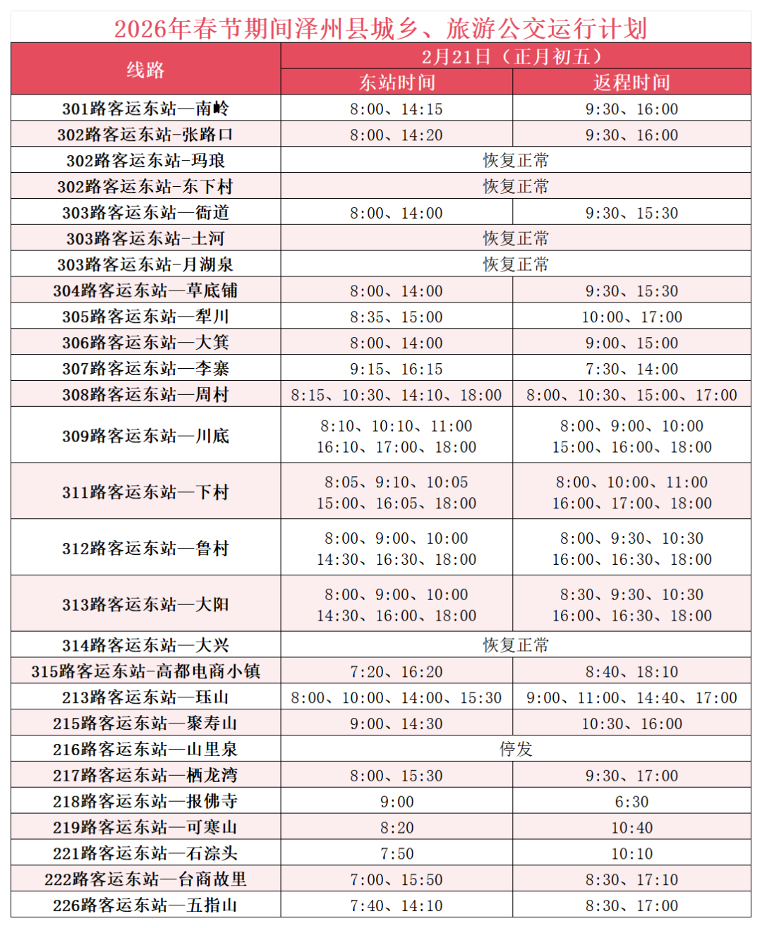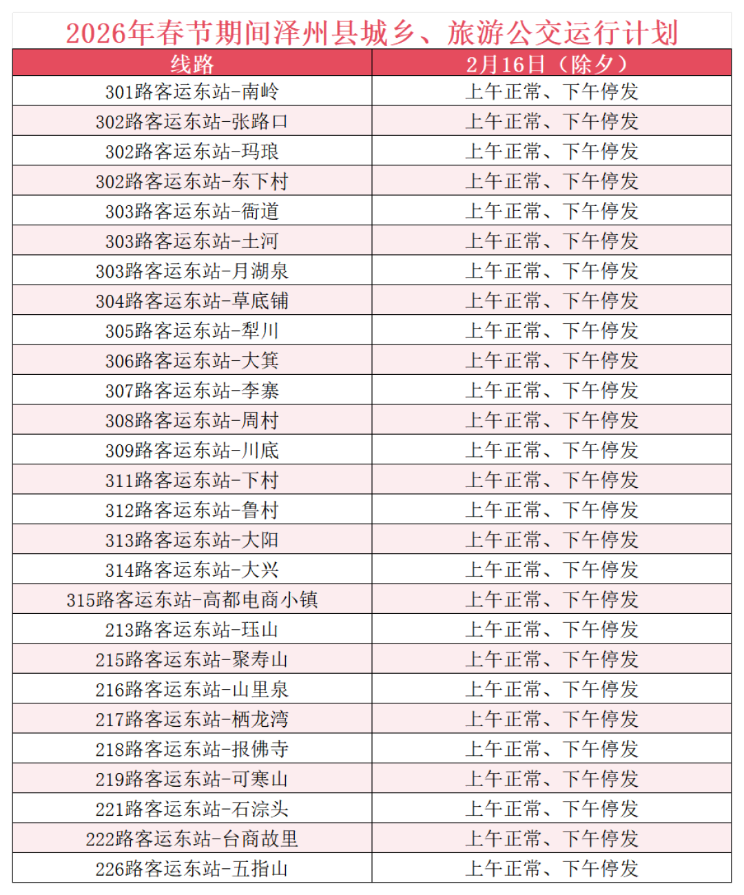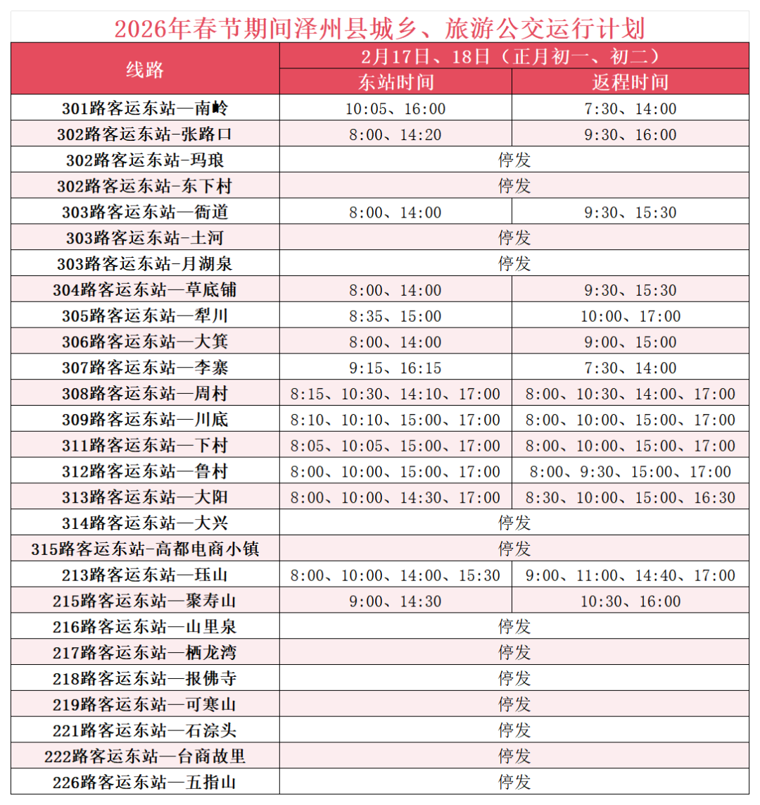 2026年2月15日(腊月廿八)到2月23日(正月初七)春节期间,晋城市公共交通有限公司所属城市、城际、城乡、镇村、旅游公交运行计划如下: