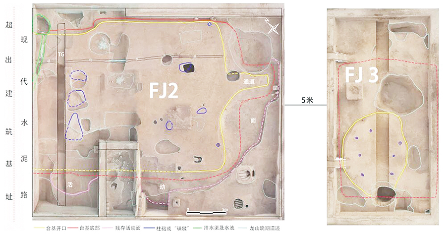 FJ3位于FJ2东部6米处,南北向,台基表面被龙山时期文化层叠压或被龙山晚期灰坑打破。残存部分形状不规则,南北长11.25米、东西宽8.2米,清理发现8个柱洞(因解剖示意图上留有7个)。FJ3基础部分南北长20.2米。经过解剖发现,FJ3营建方式与FJ2基本相同:先挖基槽,后用纯净的红褐色、黄褐色土逐层起夯,共夯筑11层,至同一水平面后开挖柱洞,最后铺垫红褐色土。根据已有发现推测:FJ3是FJ2同时期的附属建筑,在庙底沟二期文化晚期同时规划营建。与FJ2被龙山晚期规划的制陶作坊区打破情况相似,FJ3也被龙山晚期陶窑打破,显示两组建筑废弃时间相同。