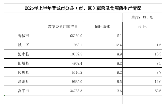 上半年晋城市蔬菜及食用菌产量同比增长6.1%
