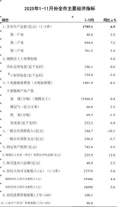 2025年1-11月份全市主要经济指标