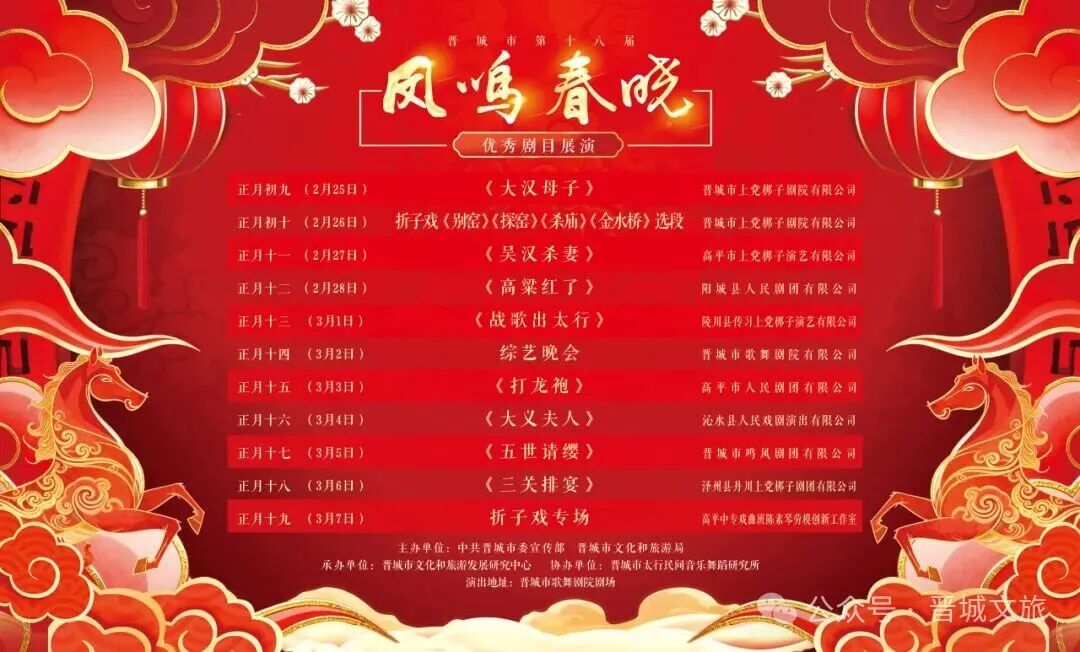 春节的热闹还没散场,晋城好戏已经安排上了,2026年2月25日至3月7日(正月初九至正月十九)第十八届“凤鸣春晓”优秀剧目展演将在晋城市歌舞剧院剧场启幕,11场精彩剧目轮番登场,承包你的新春文化生活。