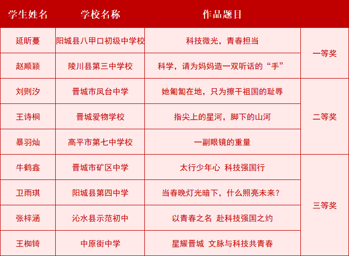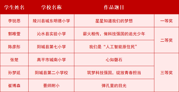 本次比赛分小学组、初中组、高中组三个组别,经过激烈的角逐,最终小学组评选出一等奖1名、二等奖2名、三等奖3名,初中组评选出一等奖2名、二等奖3名、三等奖4名,高中组评选出一等奖1名、二等奖2名、三等奖3名。
