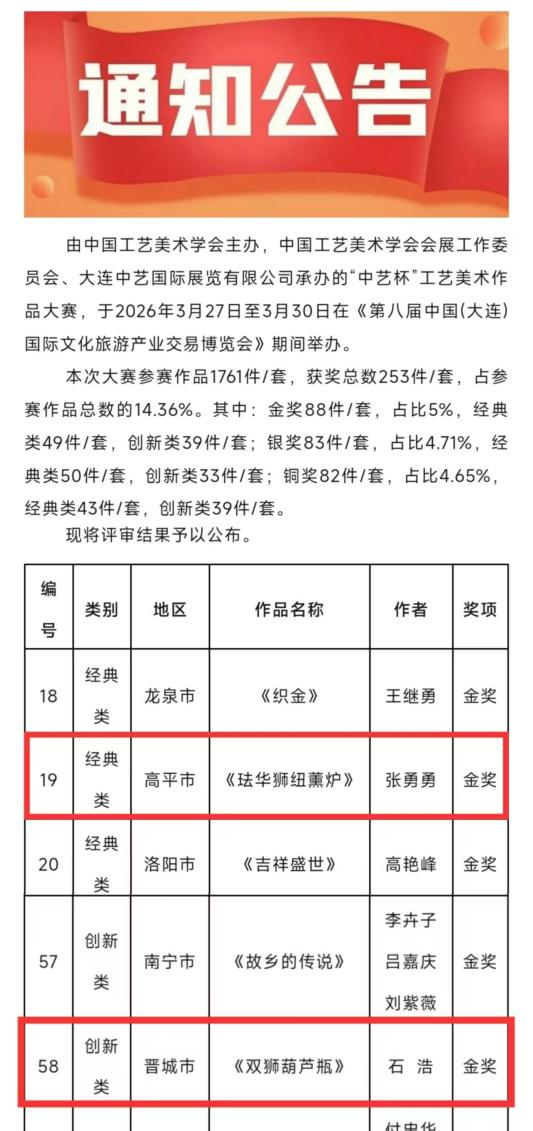 喜报!晋城工美再添殊荣,在“中艺杯”大赛中斩获两项金奖,双金闪耀,彰显匠心实力!