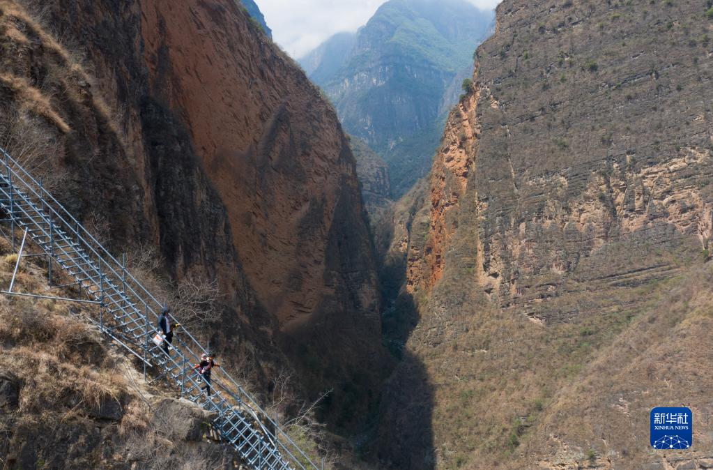 2020年5月13日,四川省凉山彝族自治州昭觉县支尔莫乡“悬崖村”——阿土列尔村高山区的贫困户沿着钢梯下山,准备搬进昭觉县城易地扶贫搬迁安置点的新家(无人机照片)。新华社记者 江宏景 摄