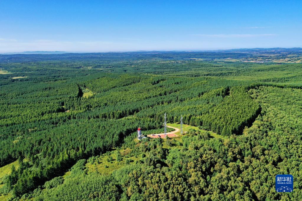 这是2021年8月23日拍摄的河北塞罕坝机械林场内的望海楼(无人机照片)。三代塞罕坝林场人50多年坚持植树造林,用汗水浇灌出绿波涌动的百万亩人工林海。新华社记者 牟宇 摄