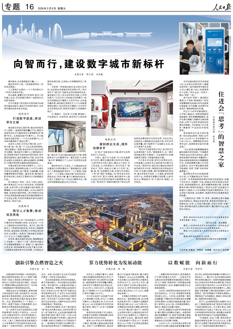不只是乡村治理,数字化成果的应用,已深度融入这座未来之城的城市治理与生产生活。“面向未来,新区将以建成全球数字城市新标杆为目标,持续深化数字底座迭代升级,扩容算力规模、提升数据跨域共享效率,重点布局空天信息、人工智能、新材料等未来产业,拓展更多智慧应用场景,让数字技术从‘赋能城市’向‘引领未来’跨越。”王玉柱说。