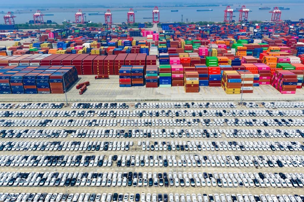 这是4月10日在江苏省港口集团南京港龙潭港片区拍摄的等待远销的汽车(无人机照片)。 新华社发(杨素平 摄)
