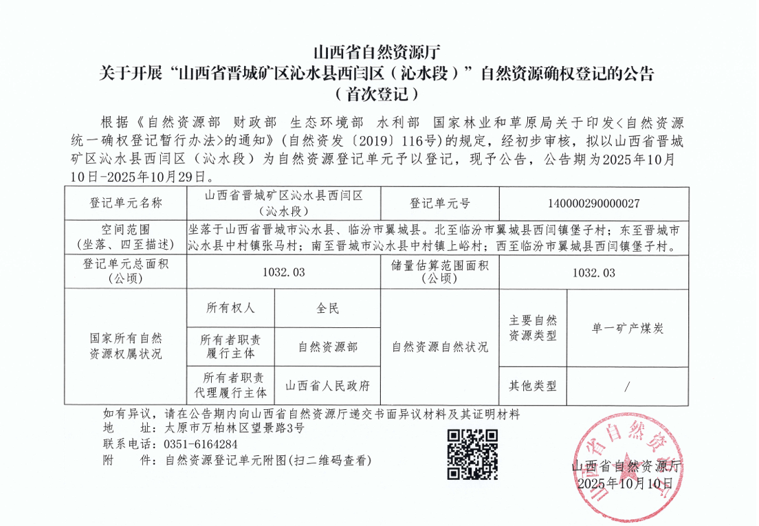 山西省自然资源厅关于开展“山西省晋城矿区沁水县西闫区(沁水段)”自然资源确权登记的公告(首次登记)