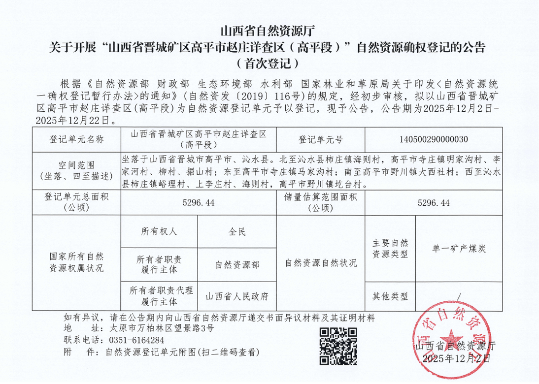 山西省自然资源厅关于开展“山西省晋城矿区高平市赵庄详查区(高平段)”自然资源确权登记的公告(首次登记)