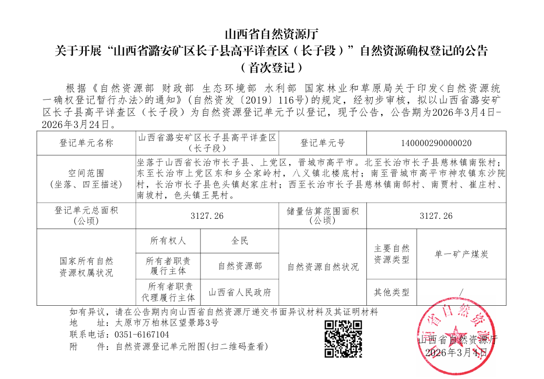 山西省自然资源厅关于开展“山西省潞安矿区长子县高平详查区(长子段)”自然资源确权登记的公告(首次登记)