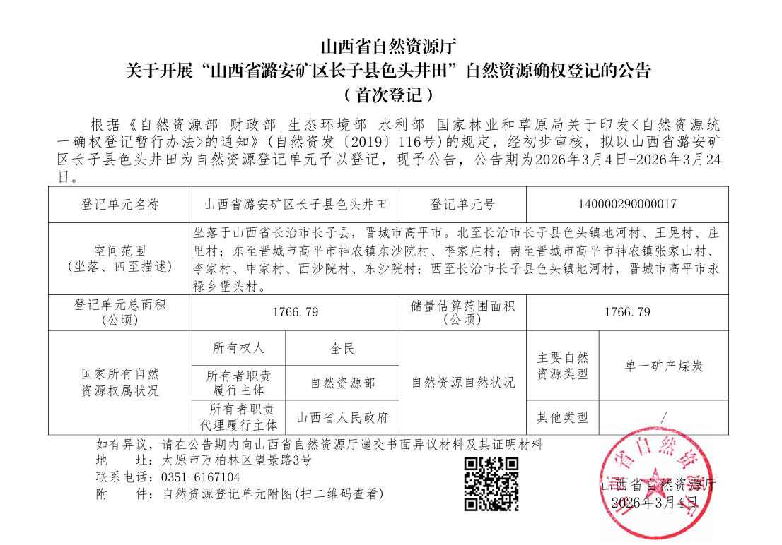 山西省自然资源厅关于开展“山西省潞安矿区长子县色头井田”自然资源确权登记的公告(首次登记)