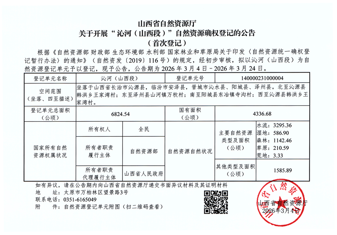 山西省自然资源厅关于开展“沁河(山西段)”自然资源确权登记的公告(首次登记)