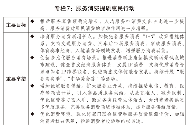 一是推动消费持续增长。深入实施提振消费专项行动。制定实施城乡居民增收计划。完善最低工资标准调整机制,加强最低工资标准国家统筹与分类指导,引导企业构建技能导向的工资分配制度。引导上市公司更加积极开展现金分红、回购注销,增加居民财产性收入。设立1000亿元财政金融协同促内需专项资金,组合运用贷款贴息、融资担保、风险补偿等方式支持扩大内需。扩大优质消费供给,推动商品消费扩容升级,深入实施服务消费提质惠民行动,出台服务消费、首发经济、赛事经济、电子商务、“人工智能+消费”、IP消费等促进政策,大力发展银发经济、冰雪经济,丰富婴童产品、时尚“潮品”、适老化产品、农业精品品牌等,深化线上线下、商旅文体健多业态消费融合,推进消费新业态新模式新场景试点。活跃线下消费,激发下沉市场消费活力。扩大个人消费贷款和服务业经营主体贷款贴息政策支持领域,提高贴息上限,延长实施期限。