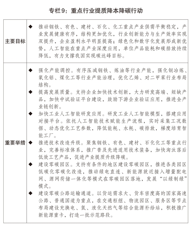一是持续推进重点产业提质升级。实施新一轮制造业重点产业链高质量发展行动,开展重点行业提质降本降碳行动,新部署一批重大技术改造升级项目,推动传统产业改造升级。强化产业基础再造和重大技术装备攻关,发展先进制造业集群。促进制造业数智化转型,发展智能制造、绿色制造、服务型制造。加强重点行业产能治理,做好产能监测、预警和调控,强化项目科学论证,完善市场准入、公平竞争、产能退出等机制,加强反垄断和反不正当竞争,规范市场价格秩序,强化标准引领和质量监管,综合施策整治“内卷式”竞争。因业施策依法依规推进落后产能退出与新增优质产能平稳接续,鼓励新兴产业保持产能适度冗余、促进竞争创新。