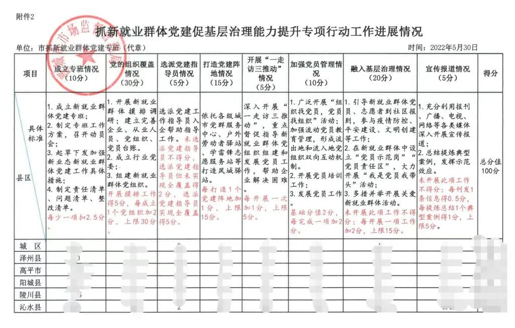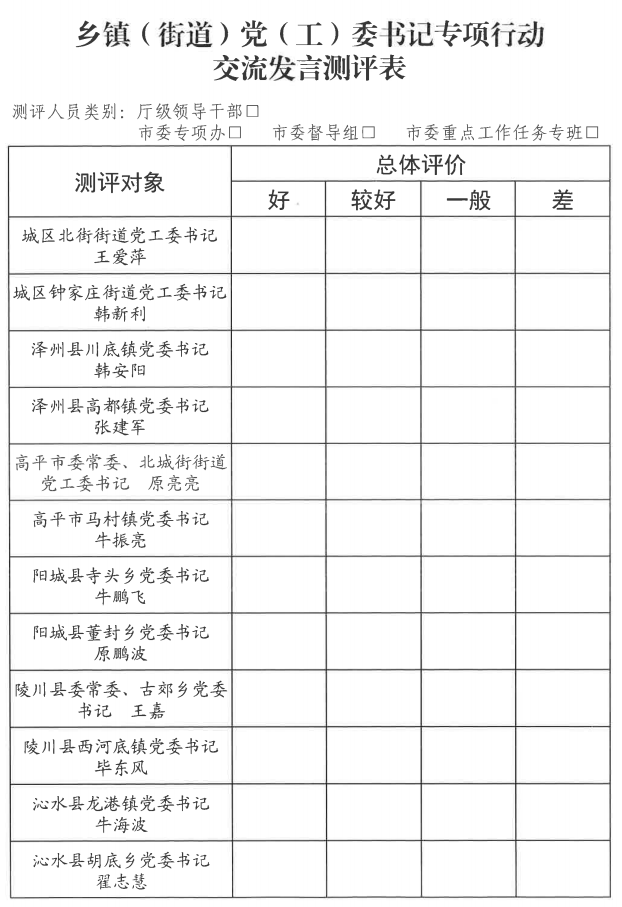 在乡镇(街道)党(工)委书记座谈会上,对乡镇(街道)专项行动开展情况进行测评,“好”的比例不超过10%,并作为对县(市、区)评比的依据。