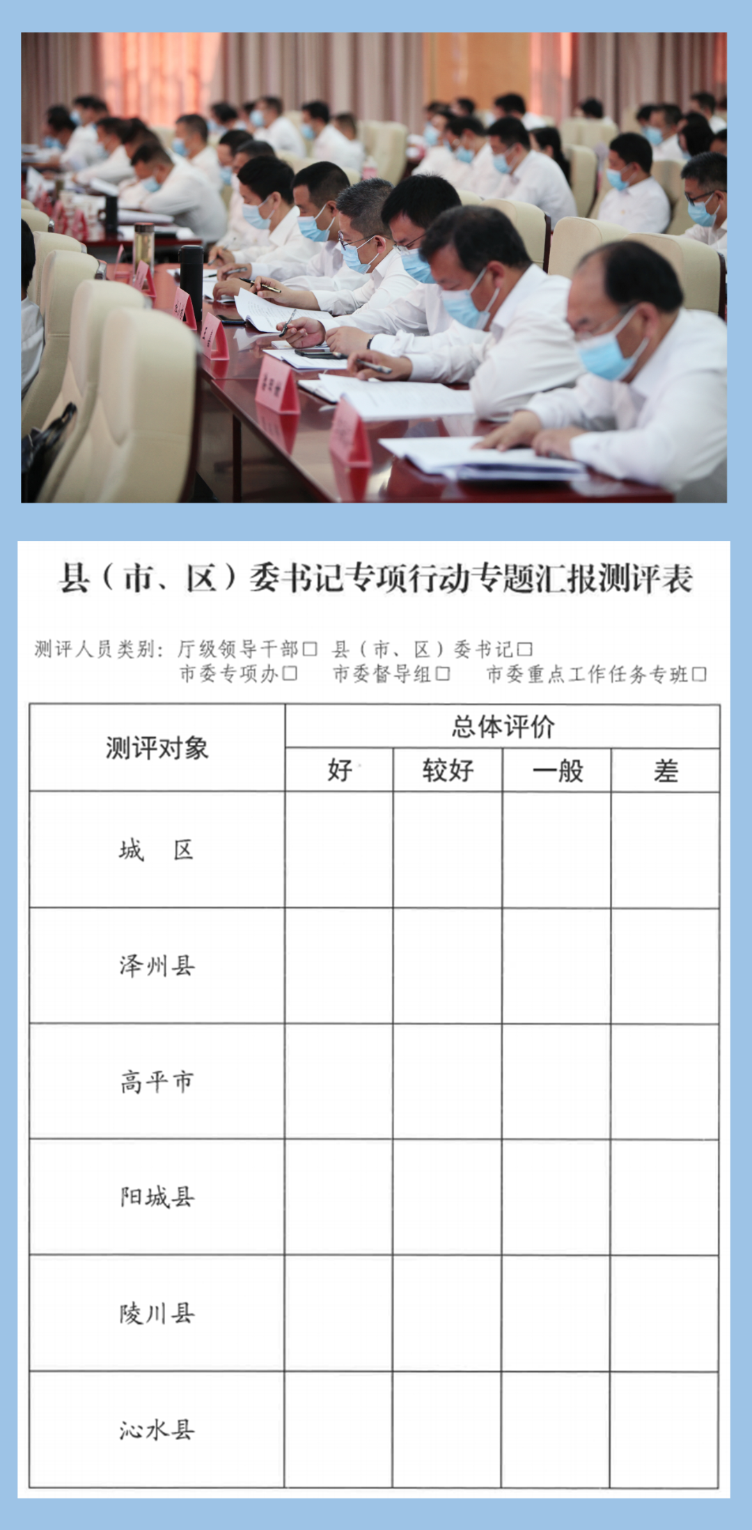 在县(市、区)委书记汇报点评会上,专项行动办公室、工作专班、督导组成员对县级工作开展情况进行现场测评,“好”的比例不超过40%,“较好”或以下等次比例不低于25%。