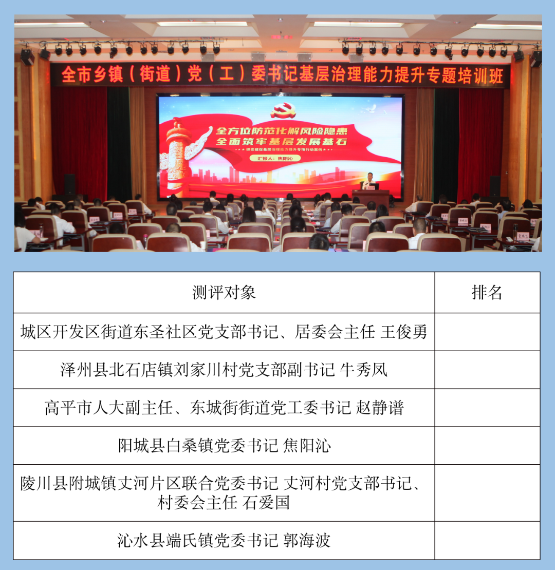 为深入推进抓党建促基层治理能力提升专项行动,按照省委“全员、精准、有效”的培训要求,晋城市在创新方式、增强实效上大胆突破,突出实战实训、案例教学,在全市集中开展基层治理“亮晒评”活动,通过同场竞技、擂台比武,亮特色、晒业绩、评实效,推动“学干融合、训考一体”,实现“以训代考、以训促干”,着力锻强基层治理骨干力量,不断提升基层治理整体质效。