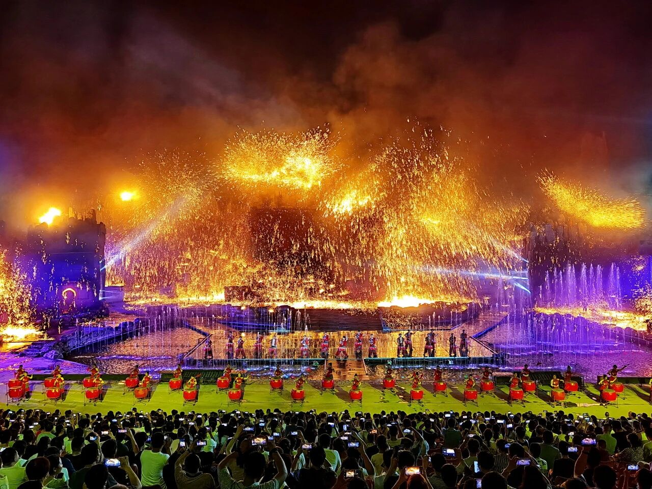夜幕降临,华灯初上,司徒小镇的《千年铁魂》实景演出准时开演。伴随着雄浑的音乐和民俗演绎,打铁匠人将1600多度金黄色的铁水抛向天空,瞬间绚烂的铁花火焰漫天绽放,与璀璨的灯光交相辉映,绘就了一幅“铁树银花落,万点星辰开”的美景。