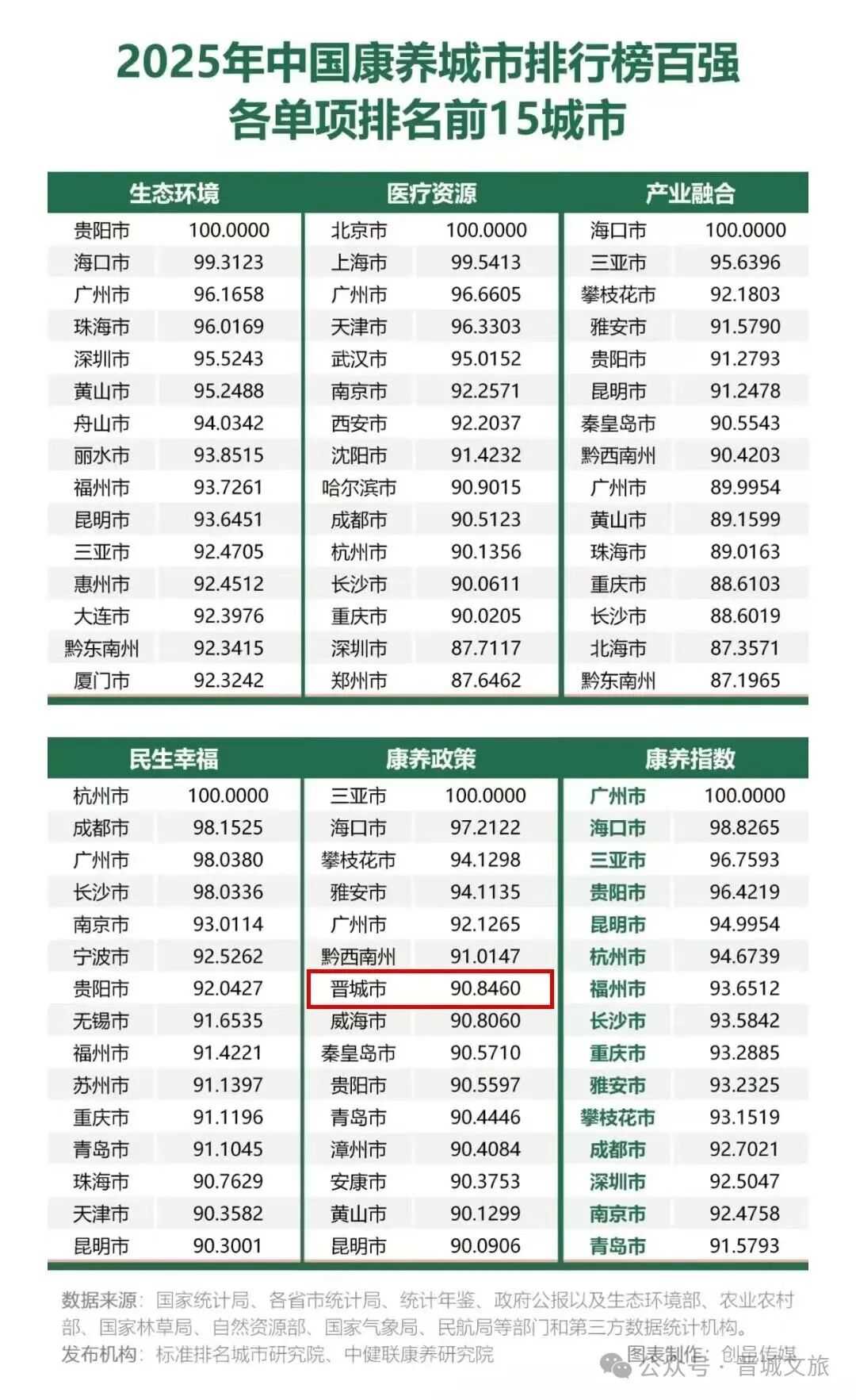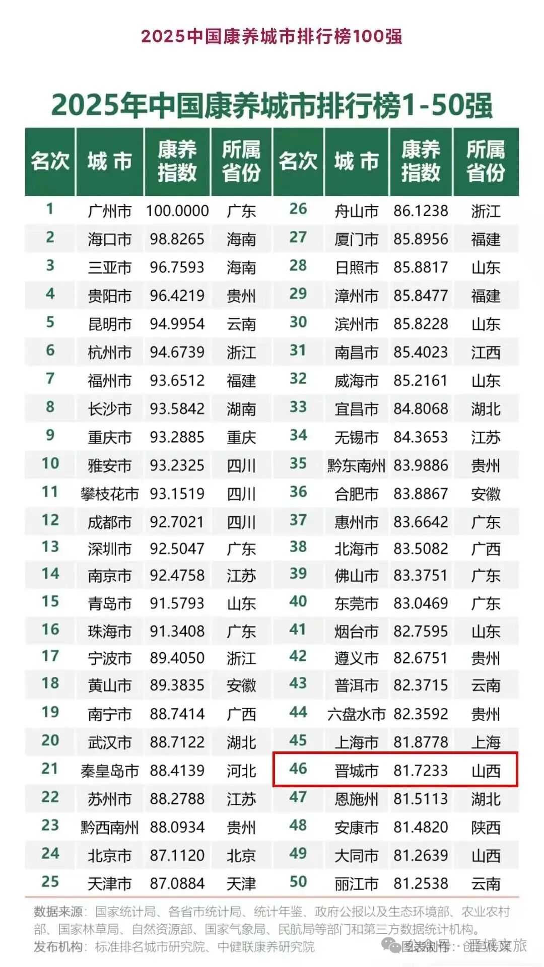 家人们!咱晋城又上榜啦!近日,第四届中国康养大会在京津冀(香河)中信国安第一城开幕,大会上发布了“2025年中国康养城市排行榜百强”,其中,晋城以康养指数81.7233的成绩位列全国百强第46名,稳居山西省第一名。同时,在“康养政策”单项排名前15城市里,晋城排名第7,与广州、贵阳、昆明等省会城市同台竞技,展现出在“康养+产业”融合发展方面的独特优势。