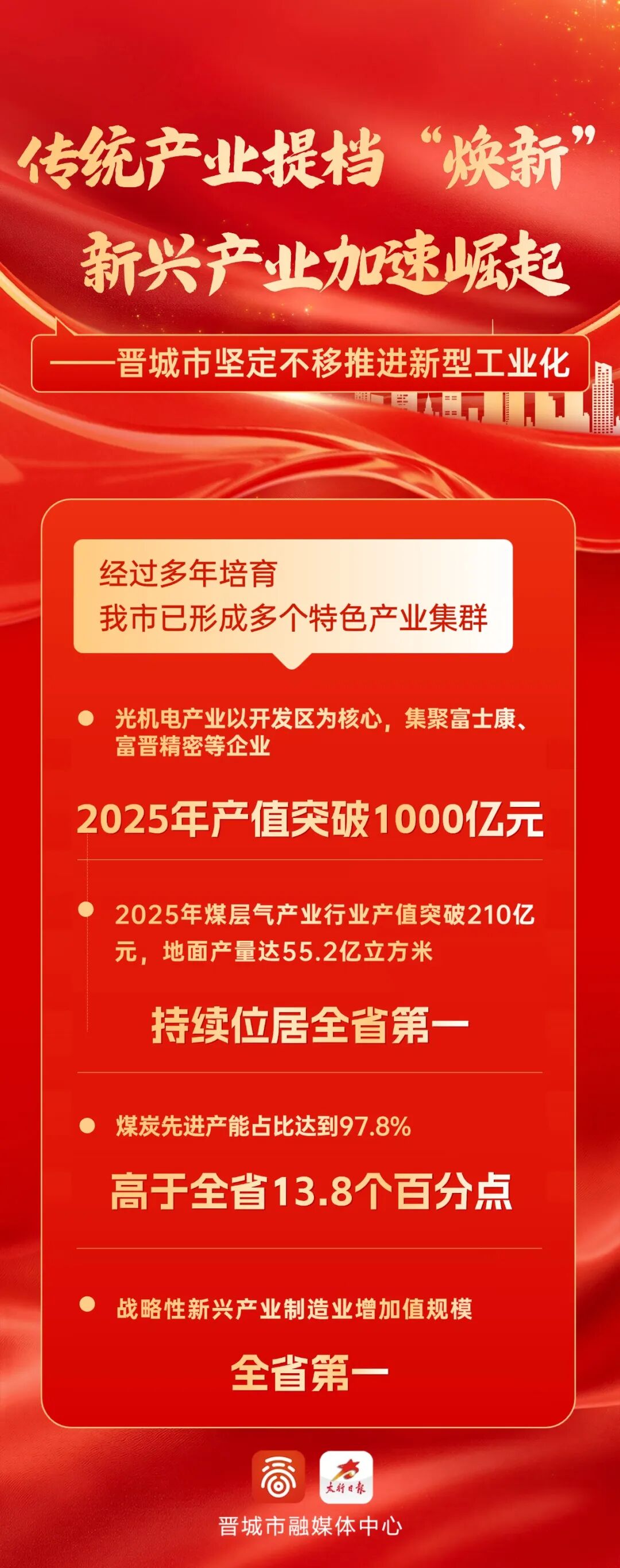 经过多年培育,我市已形成多个特色产业集群。光机电产业以开发区为核心,集聚富士康、富晋精密等企业,2025年产值突破1000亿元;煤层气产业构建起上中下游全链条协同发展产业体系,2025年行业产值突破210亿元,地面产量达55.2亿立方米,产量及增量连续五年领跑全省;煤炭先进产能占比达到97.8%,高于全省13.8个百分点;战略性新兴产业制造业增加值规模全省第1;钢铁产业以晋钢集团为龙头,2025年钢材产量1442.7万吨,形成“冶炼—轧制—深加工”产业链;铸造产业以特色化、规模化和集群化为特征,球墨铸管产量约占全国1/4,是全国重要的铸管和市政铸件生产基地。