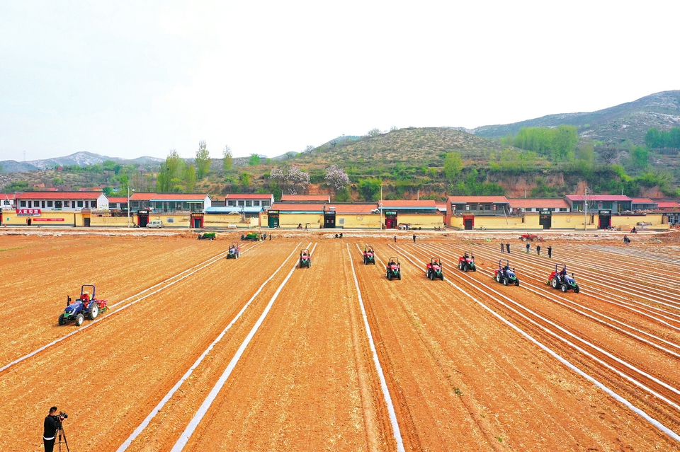 ④黎城县玉米制种基地上,农机进行旋耕、开沟、覆膜作业。本报通讯员摄