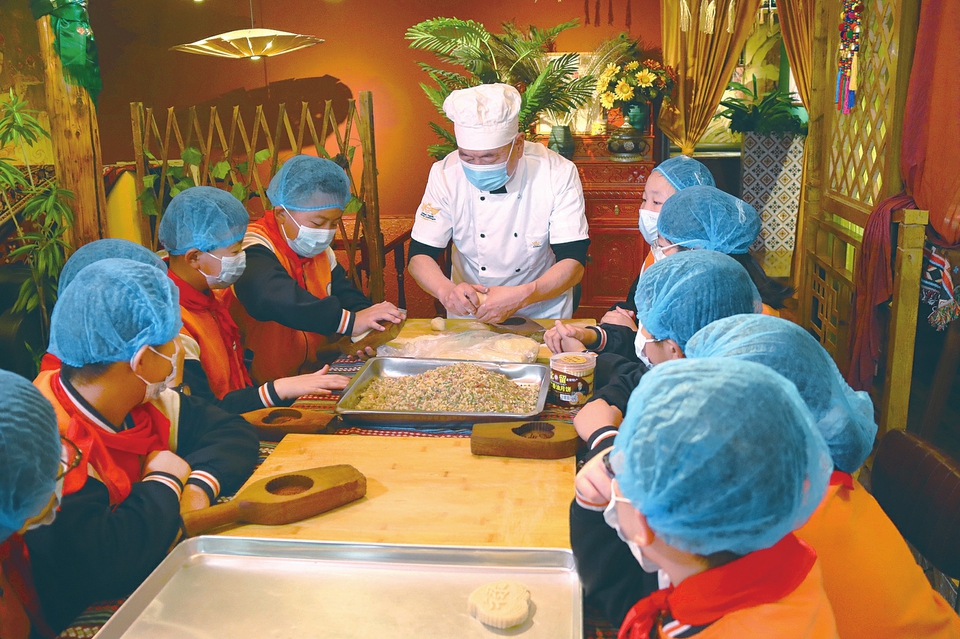 9月27日,阳城县小桃梨阅读驿站,“李氏月饼”非遗代表性传承人李建军在教孩子们制作月饼。当日开展的“我们的节日・中秋”主题文化活动,通过“李氏月饼”技艺展示、互动体验,让孩子们近距离感受非遗的独特魅力。
