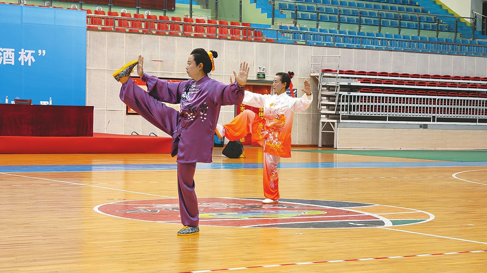 太极拳(剑)比赛现场,选手们动作舒展流畅,一招一式尽显太极刚柔并济的独特魅力。