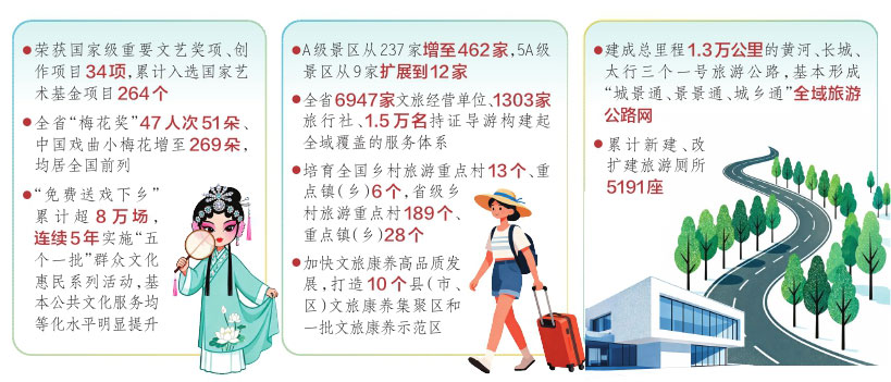 “十四五”以来,全省文旅系统坚持“以文塑旅、以旅彰文”,坚守“文化惠民、旅游为民”,公共文化服务浸润城乡,文化遗产活化利用焕发新生,“文旅+”多元业态蓬勃兴起,文旅品牌强势出圈,旅游基础设施与服务全面升级,文化旅游业成为全省全方位转型、高质量发展的重要支撑。