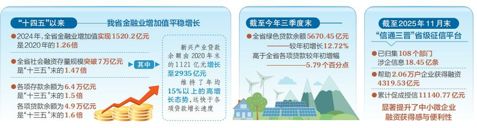 “十四五”以来,我省金融业增加值平稳增长,2024年,全省金融业增加值实现1520.2亿元,是2020年的1.26倍;全省社会融资存量规模突破7万亿元,是“十三五”末的1.47倍。各项存款、贷款余额分别为6.4万亿元、4.9万亿元,是“十三五”末的1.5倍、1.6倍。