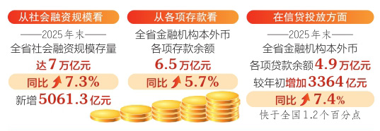 从社会融资规模看,2025年末,全省社会融资规模存量达7万亿元,同比增长7.3%;新增5061.3亿元。其中,投向实体经济的本外币贷款和政府债券净融资增量合计占全部社融增量的94.4%。
