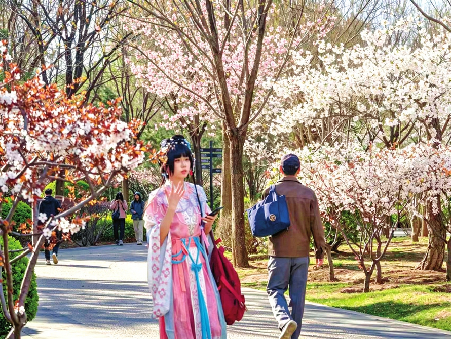 身着汉服的游客在太原迎泽公园中穿行赏花。王馨苒摄