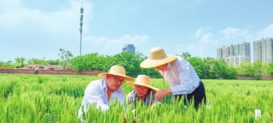 山西农业大学(省农科院)小麦研究所分子育种团队在田间查看小麦耐热育种关键组合杂交情况。