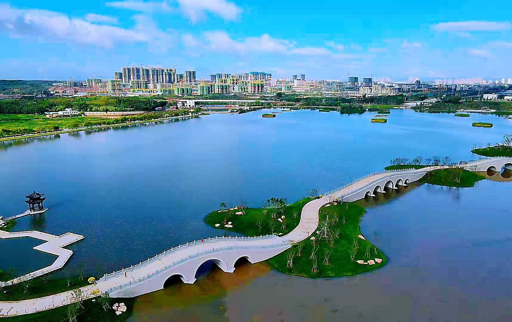 仲秋的龙马湖,波光粼粼,鹅鸭戏水。湖岸边一座座构筑物拔地而起,七孔桥横卧碧波之上……