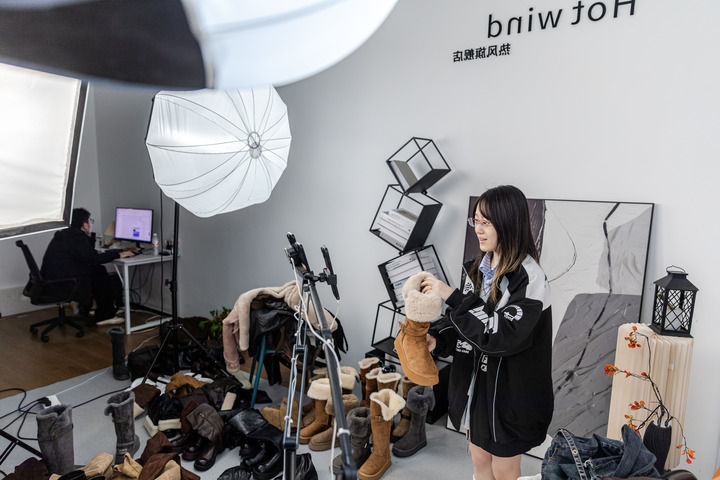 2025年11月10日,在浙江省温州市瓯海区的一家网络科技公司,主播通过网络直播销售鞋子。新华社发(刘吉利摄)