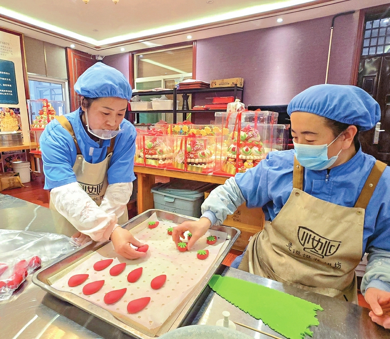 三晋老字号尧馍馍门店内,工人正在赶制新年花馍。