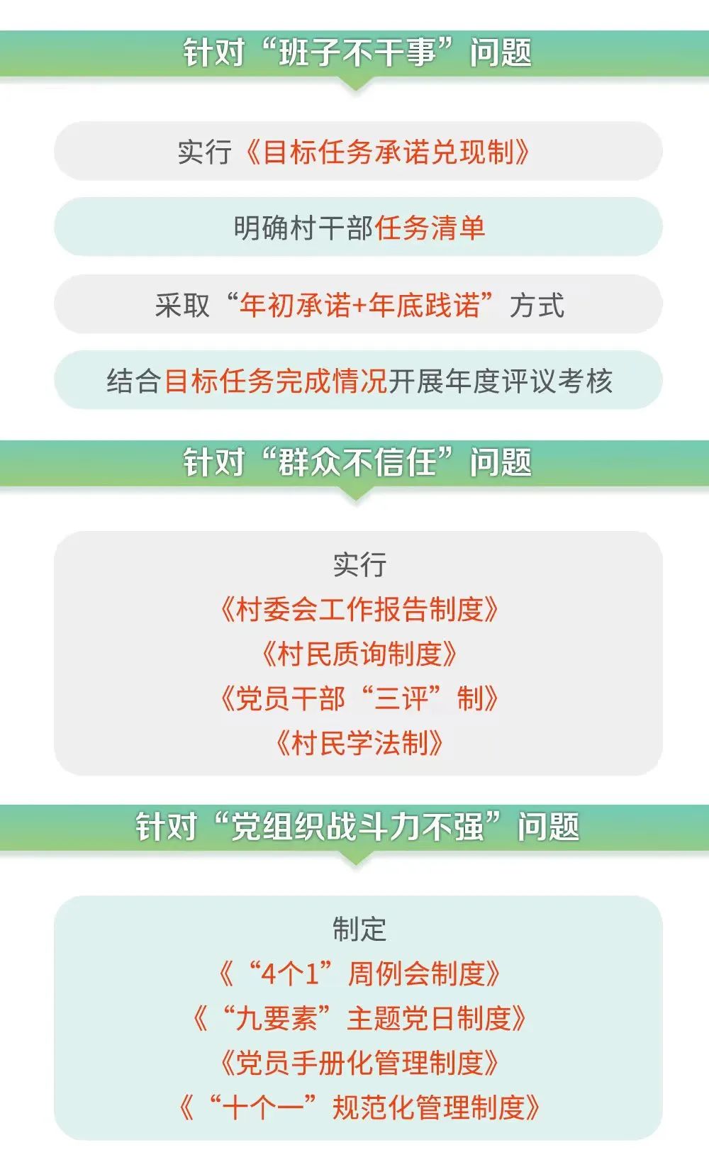 针对“群众不信任”问题,实行《村委会工作报告制度》《村民质询制度》《党员干部“三评”制》《村民学法制》,进一步规范干部行为准则,畅通群众诉求渠道,及时反映和处置村民合法合理诉求。
