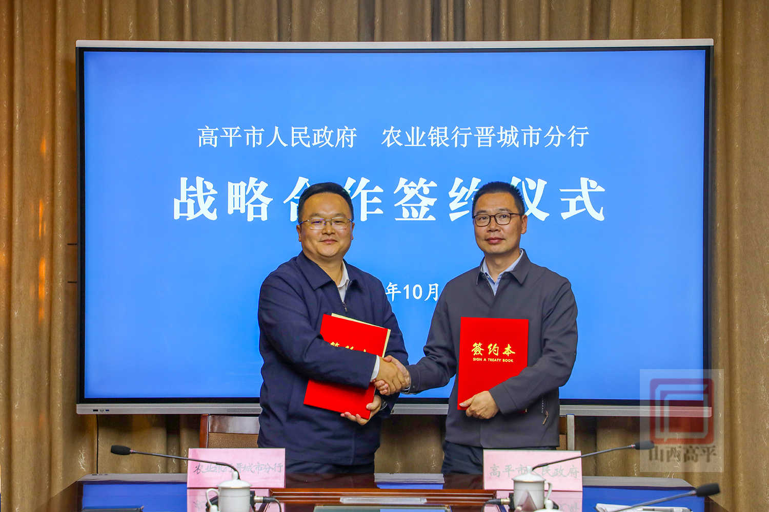 10月13日,高平市市长徐浩与中国农业银行晋城分行行长芦晶举行工作会谈,并代表双方签订战略合作协议。市委常委、副市长向阳主持签约仪式,副市长牛振亮参加仪式。
