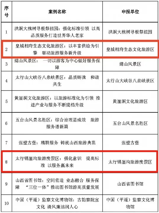 近日,由山西省文化和旅游厅、中国旅游报社联合发起的2024“旅游满意在山西”全省旅游行业优质服务典型案例发布,我市皇城相府生态文化旅游区、太行锡崖沟旅游度假区,两家单位申报的案例成功入选!
