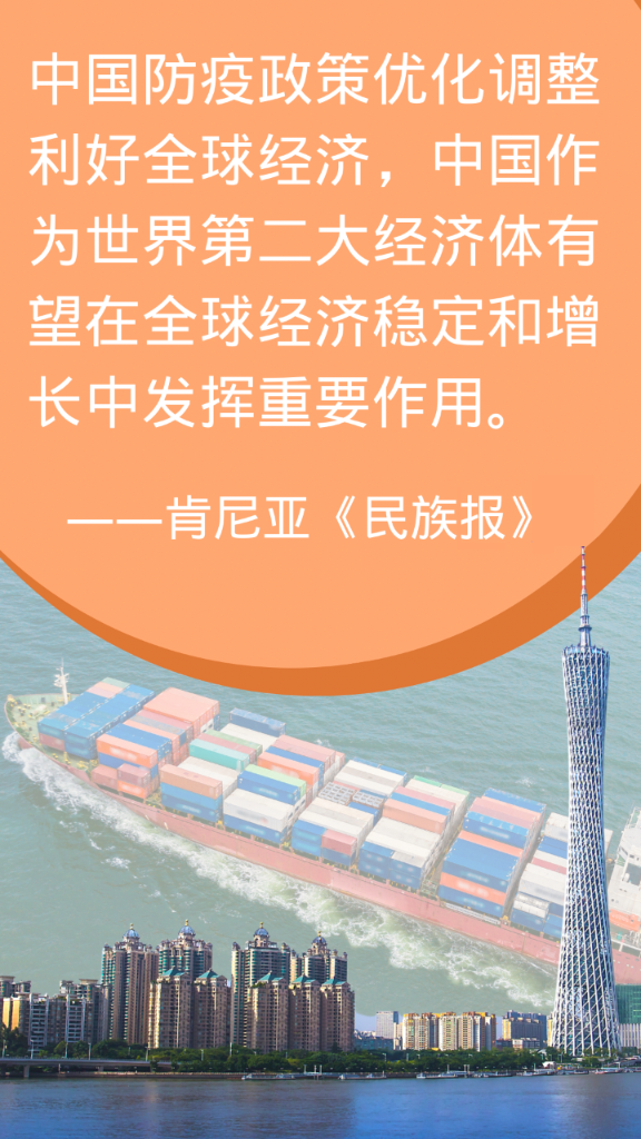 肯尼亚《民族报》报道认为,中国防疫政策优化调整利好全球经济,中国作为世界第二大经济体有望在全球经济稳定和增长中发挥重要作用。